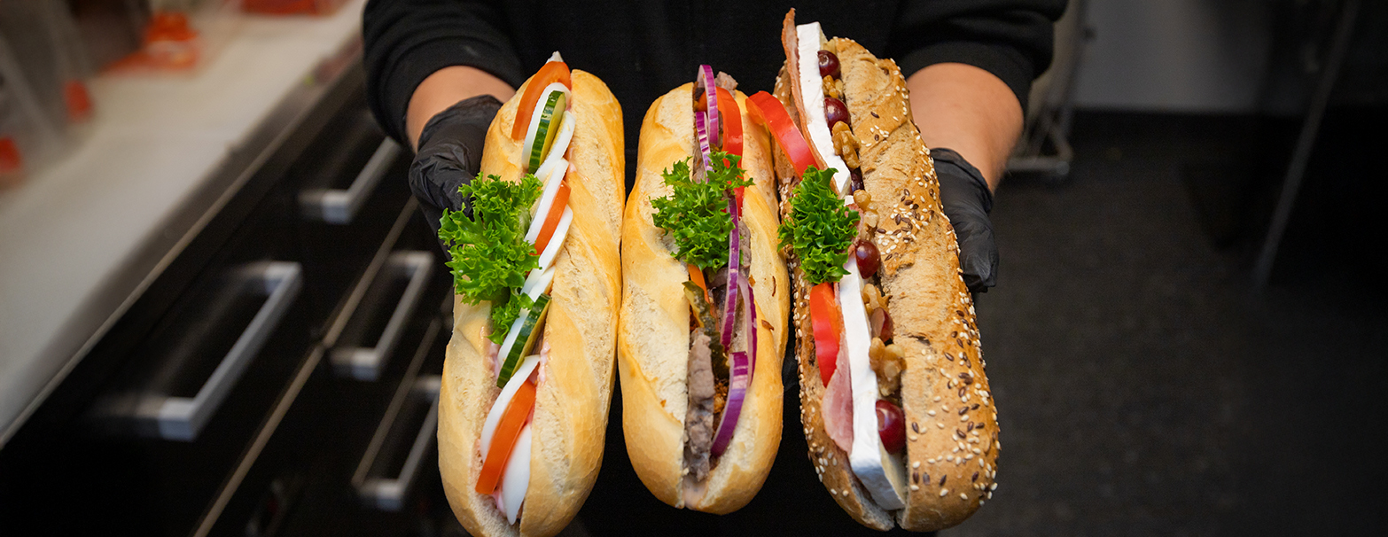 Et utvalg av våre signaturbaguetter. Vi smører også på bestilling — du velger fyll og tilbehør. Trenger du glutenfritt, kontakt oss 30 minutter før henting.